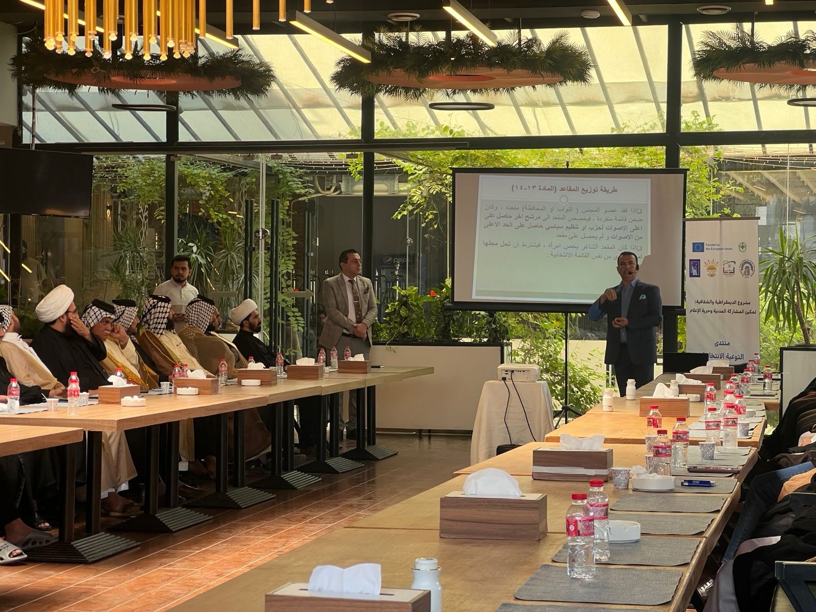 نفذت شبكة عين لمراقبة الانتخابات والديمقراطية منتدىً توعوياً مخصصاً لشيوخ العشائر ورجال الدين في محافظة ميسان بتاريخ 24 آب 2025، وذلك ضمن أنشطة مشروع "الديمقراطية والشفافية: تمكين المشاركة المدنية وحرية الإعلام"، وبالشراكة مع شبكتي تموز وشمس، وبدعم من الاتحاد الأوروبي، وبالتعاون مع منظمة مساعدات الشعب النرويجي.