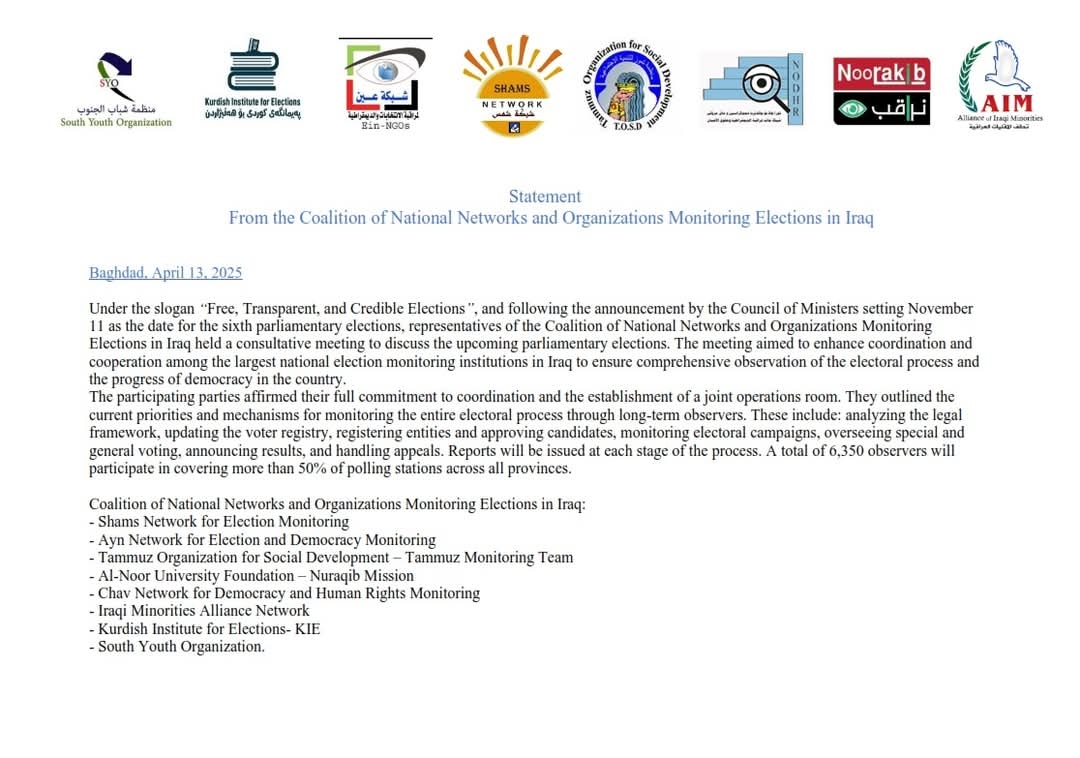 Statement by the Alliance of National Election Monitoring Networks and Organization in Iraq