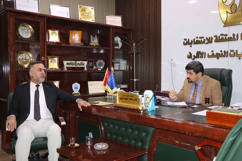 Mr. Yasser Ammar Tweij, Director of the Independent High Electoral Commission (IHEC) Office in Najaf Governorate, received a delegation representing the Alliance of Election Monitoring Networks, in the presence of Mr. Ahmed Radi, Head of the Political Parties Department, and Mr. Haider Muttawar, Head of the Media Department at the Commission.