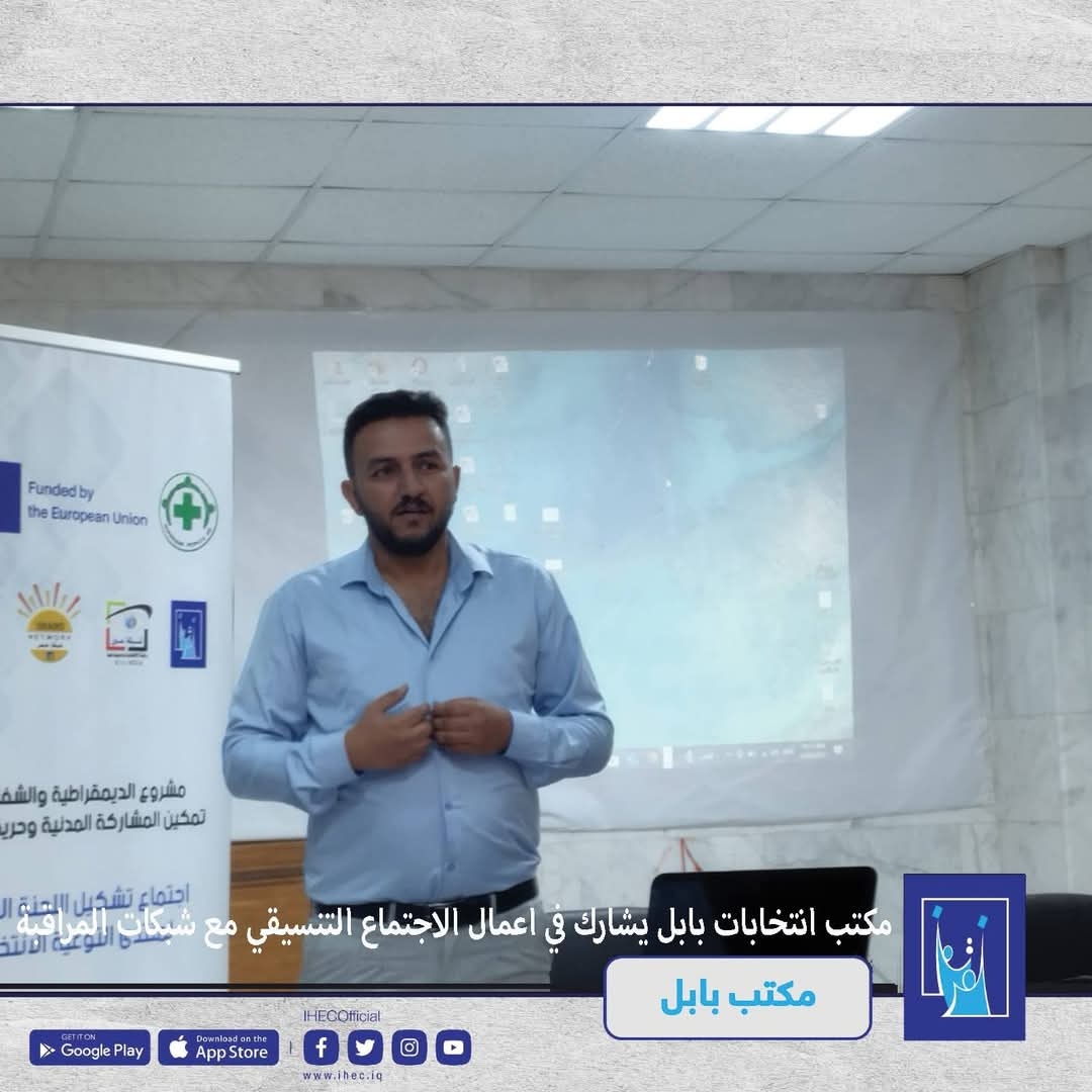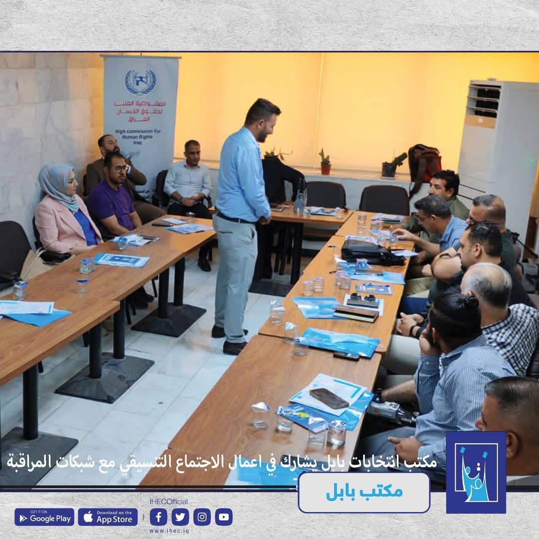 The Babil, represented by the Media and Public Communication Division and the Political Parties and Candidates Affairs Division, participated in the coordination meeting of the Electoral Awareness Forum. The meeting was held in cooperation with the Union of Local Monitoring Networks—Shams, Tammuz, and EIN—and attended by representatives from several unions, syndicates, and civil society organizations in the governorate.